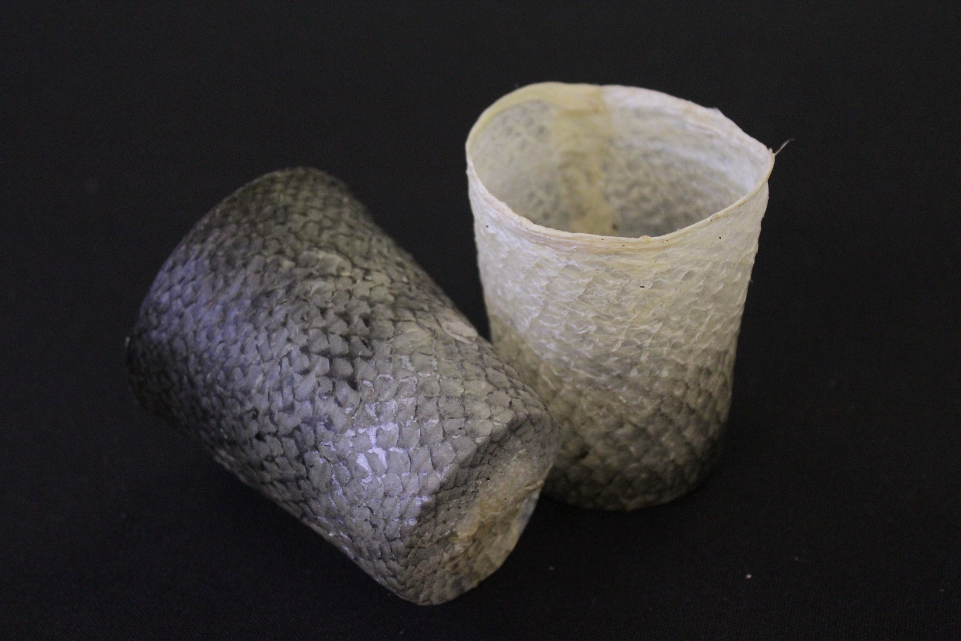 This project started with a drawing as my starting point of inspiration. In the small corner of the drawing I discovered something that looked like a fish. This brought me to the idea to go to several fish shops to ask them to collect all their trash. After just one week I collected bags full of fish skin. The first step was a pretty obvious one; I tried to make fish leather. After a while I succeeded and wanted to try the opposite; what if you would harden the skin? What were the new possibilities now?
